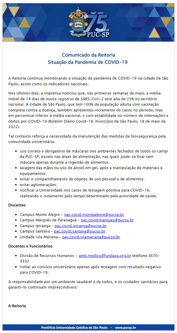 A Reitoria divulgou comunicado reforçando à comunidade que fique atenta e siga as normas de biossegurança sanitária contra a Covid-19 e afirmou que continua atenta e monitorando a situação da pandemia de COVID-19 na cidade de São Paulo, assim como os indicadores nacionais.