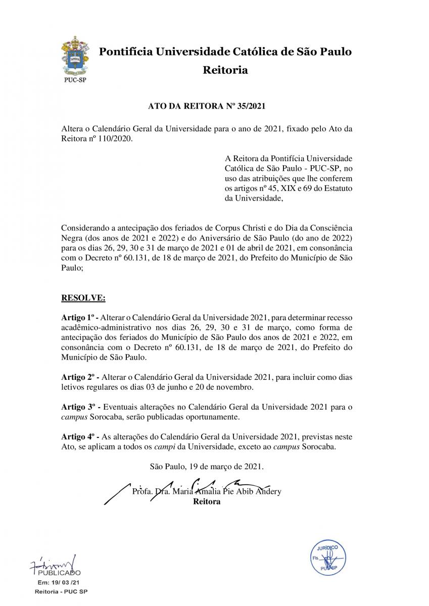 A Reitoria, seguindo o Decreto nº 60.131, de 18 de março de 2021, do Prefeito do Município de São Paulo, antecipou os feriados de Corpus Christi e do Dia da Consciência Negra (dos anos de 2021 e 2022) e do Aniversário de São Paulo (do ano de 2022) para os dias 26, 29, 30 e 31 de março de 2021 e 01 de abril de 2021.