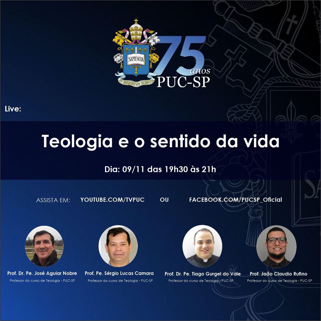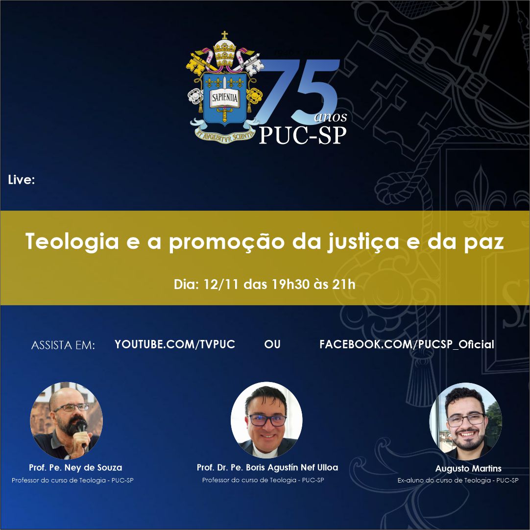 O curso de graduação em Teologia realiza duas lives em novembro. Dia 9/11, das 19h30 às 21h, será abordado o tema Teologia e o sentido da Vida. Já no dia 12/11, das 19h30 às 21h, será Teologia e a promoção da justiça e da paz.