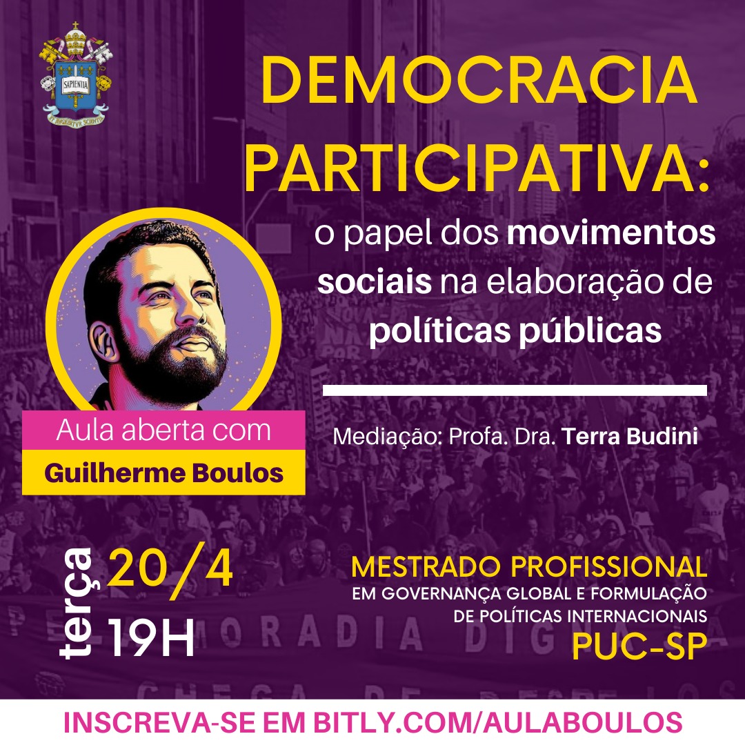 O Pós em Governança Global e Formulação de Políticas Internacionais realiza, dia 20/4, às 19h, a aula aberta Democracia Participativa: o papel dos movimentos sociais na elaboração de políticas públicas, com Guilherme Boulos (PSOL) e mediação da profa. Terra Budini (RI).