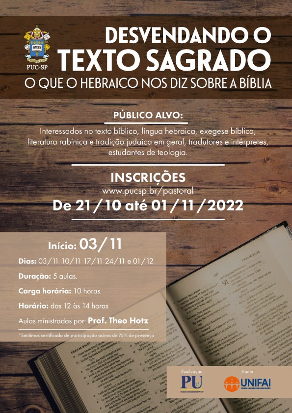 Estão abertas, de 21/10 a 1º/11, as inscrições para o curso Desvendando o texto sagrado: o que o Hebraico nos diz sobre a Bíblia. A atividade acontecerá dias 3, 10, 17, 24/11 e 1º/12, das 12 às 14h.