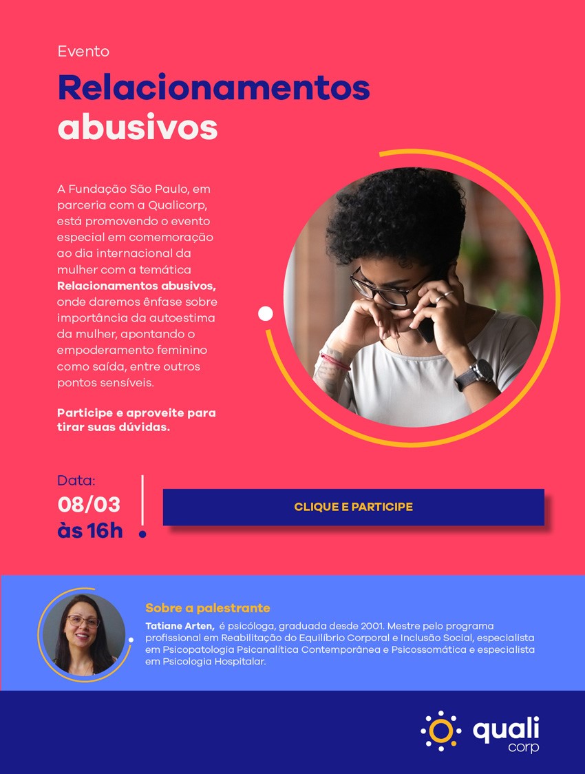 A psicóloga Tatiane Arten falará sobre o tema Relacionamentos abusivos.