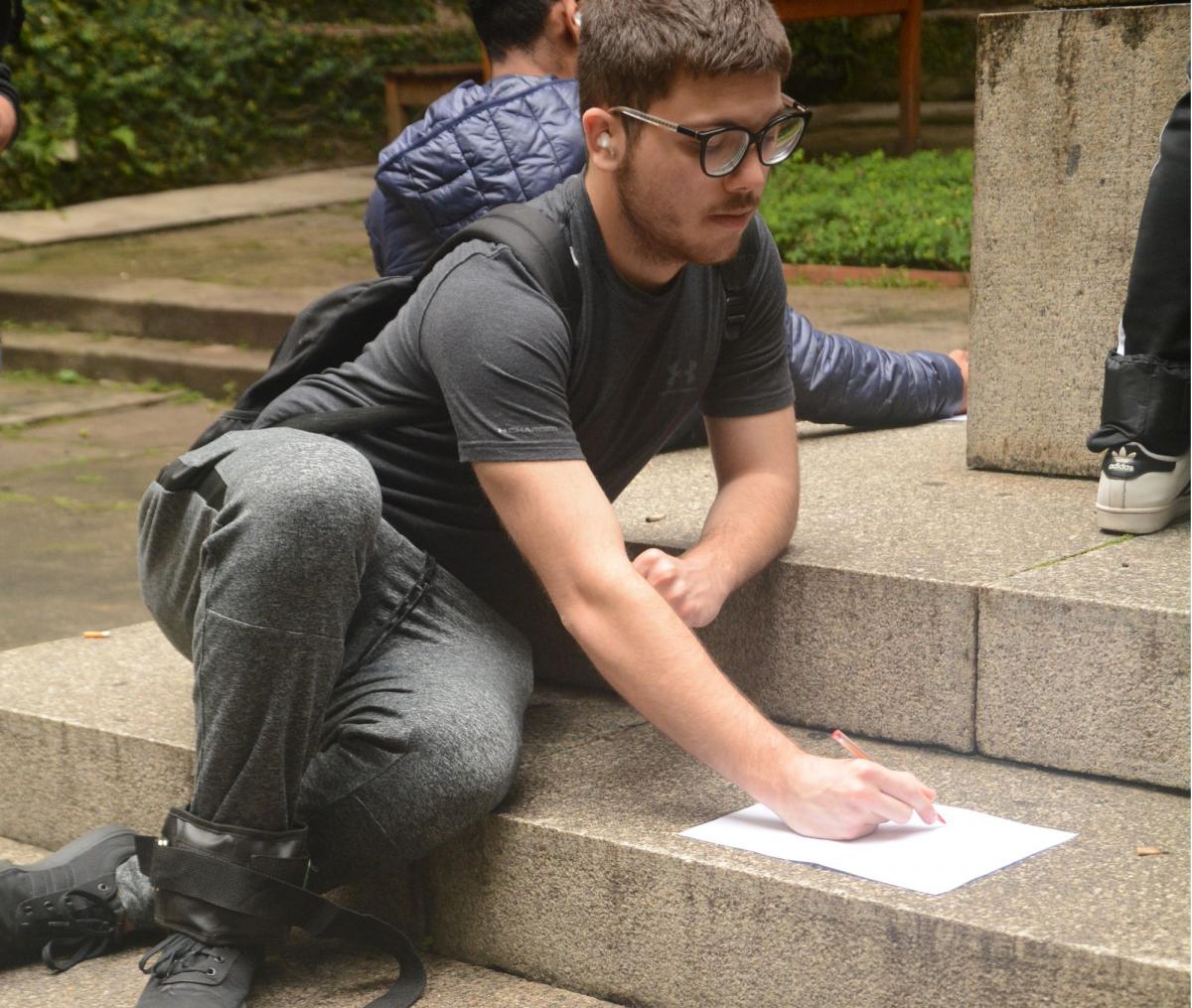 Para isso, os estudantes colocaram pesos pelo corpo, algodão nos ouvidos, óculos em quem não precisava deles e retiraram daqueles que fazem uso. Segundo o docente, a intenção era que os alunos se colocassem no lugar de um idoso quando vai preencher um documento, quando vai ao banco, ou participam de alguma atividade semelhante.