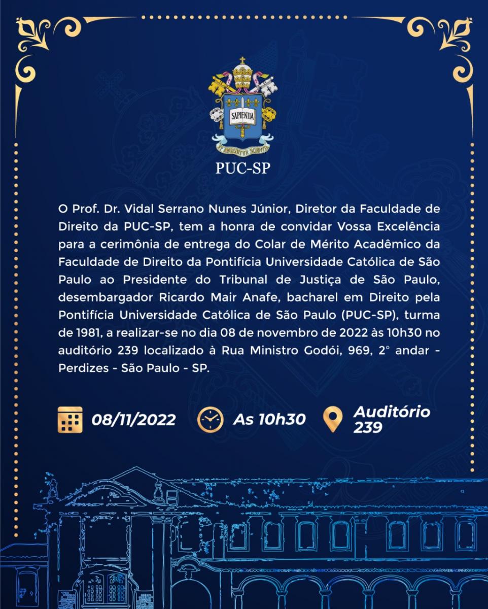 No dia 8/11, a partir das 10h30, acontece a cerimônia de entrega do Colar de Mérito Acadêmico da Faculdade de Direito da PUC-SP ao Presidente do Tribunal de Justiça de São Paulo, o desembargador Ricardo Mair Anafe.
