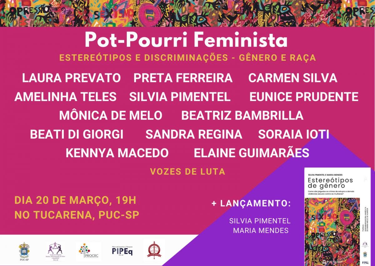 O Grupo de Pesquisa Direito, Discriminação de Gênero e Igualdade, da PUC-SP, coordenado pela profa. Silvia Pimentel (Direito), a Pró-Reitoria de Cultura e Relações Comunitárias, da PUC-SP, e o Centro Acadêmico 22 de Agosto realizam o Pot-Pourri Feminista: Estereótipos e Discriminações - Gênero e Raça, dia 20/3, às 19h, no Tucarena, com apoio PIPEq/PUC-SP.