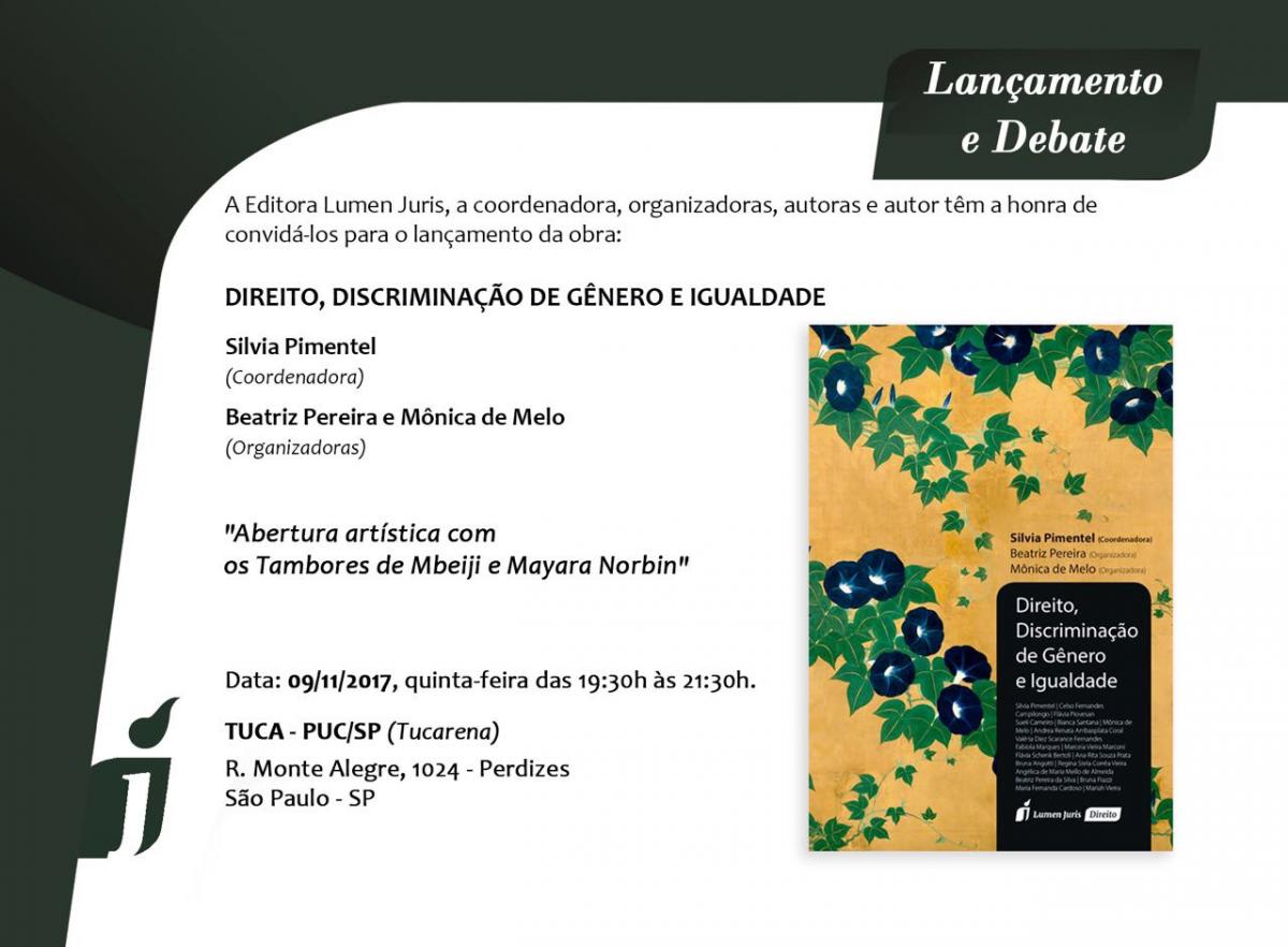 Dia 9/11, às 19h30, será lançado o livro Direito, Discriminação de Gênero e Igualdade (ed. Lumen Juris), coordenado pela profa. Silvia Pimentel (Fac. Direito). O evento acontece no Tucarena (rua Monte Alegre, 1.024) e contará com uma intervenção artística dos Tambores de Mbeji e de Mayara Norbin. Clique aqui para mais informações.