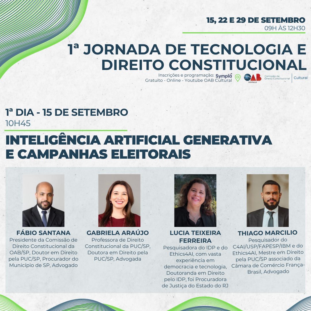 A profa. Gabriela Araújo (Direito) participa no dia 15/9, às 10h45, da "1ª Jornada de Tecnologia e Direito Constitucional", que acontece nos dias 15, 22 e 29/9, das 9 às 12h30, em formato online, com transmissão ao vivo pelo Canal Cultural OAB/SP no Youtube.