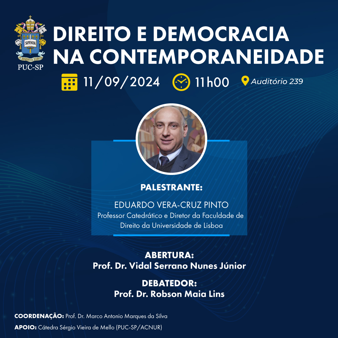 O prof. Eduardo Vera-Cruz Pinto (Universidade de Lisboa - Portugal) realiza a palestra Direito e democracia na contemporaneidade, dia 11/9, no campus Monte Alegre.