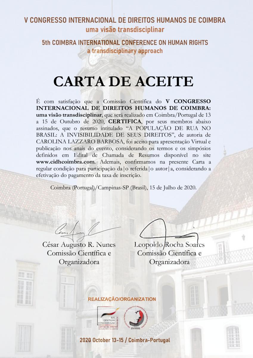 A estudante do 10º semestre de Direito, Carolina Lazzaro Barbosa, participa, em outubro, do V Congresso Internacional de Direitos Humanos da Universidade de Coimbra. Ela participa do 20. Simpósio - Efetividade dos Direitos Humanos e Fundamentais Constitucionais das Coletividades e das Pessoas Vulneravéis: Brasil, Portugal e Países Emergentes. "Falarei sobre a invisibilidade dos direitos do moradores de rua. Graças à faculdade vou ter uma oportunidade incrível. Sou eternamente grata ao curso de Direito e à PUC-SP. Acho que, para a faculdade, também será de grande destaque uma aluna da graduação participando das mesas de apresentações de um congresso internacional. A PUC-SP nos faz buscar sempre mais".