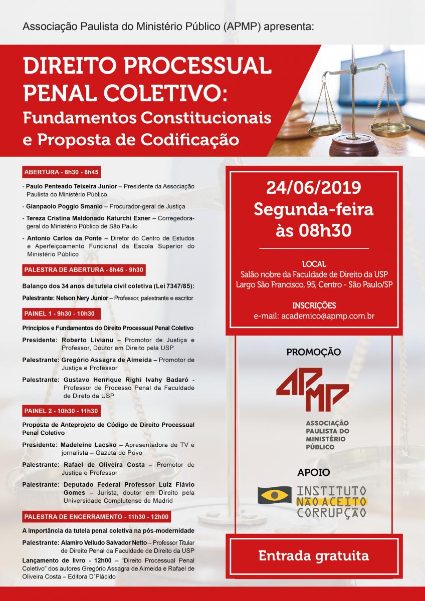Dia 24/6, às 8h30, a Associação Paulista do Ministério Público (APMP) realiza o evento Direito Processual Penal Coletivo: Fundamentos Constitucionais e Proposta de Codificação, no Salão Nobre da Faculdade de Direito da USP. Clique aqui para acessar a programação completa e como se inscrever.