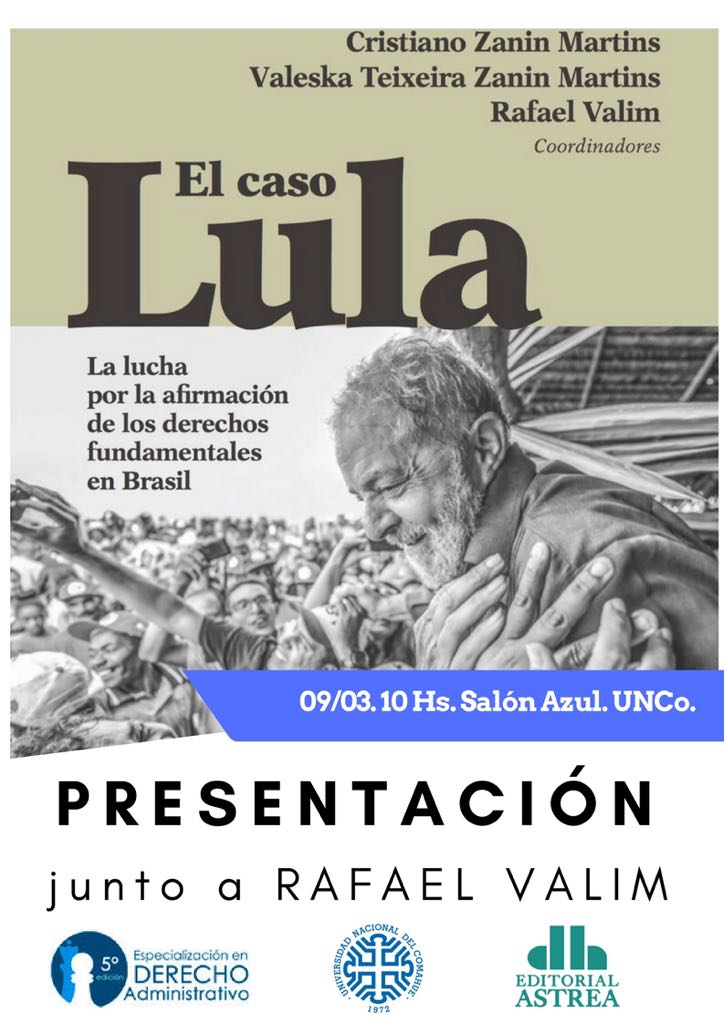 Dia 9/3, às 10h, o prof. Rafael Valim (Fac. de Direito) lançará na Universidade Nacional de Comahue (Argentina) o livro “El caso Lula: la lucha por la afirmación de los derechos fundamentales en Brasil” (Editora Astrea).