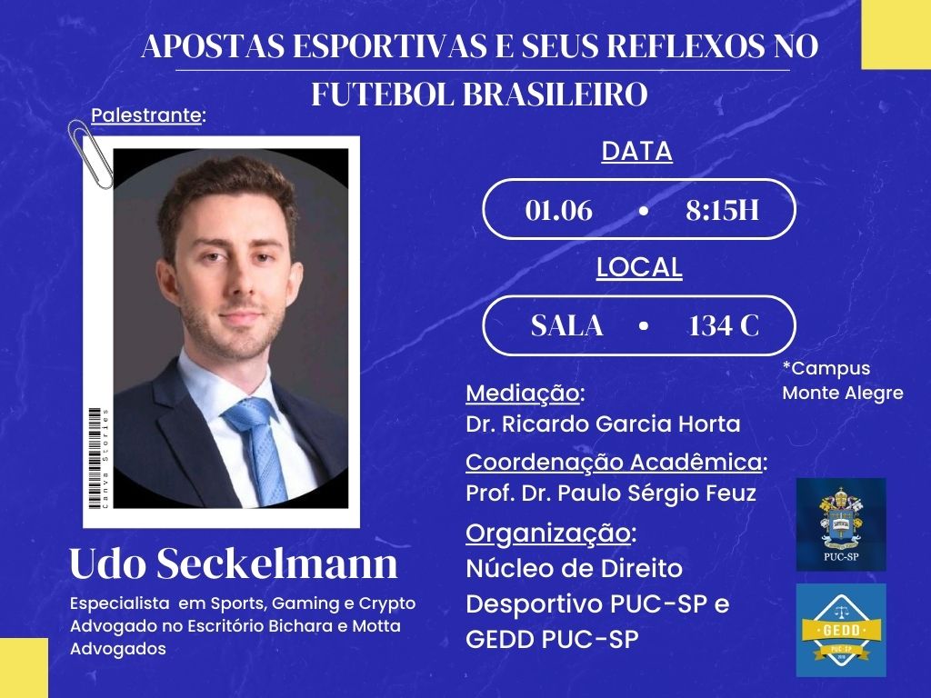 - 8h, na sala 134 C (1º andar do prédio novo), o especialista em sports, gaming e crypto, UDo Seckelmann aborda o tema “Apostas Esportivas e seus Reflexos no Futebol Brasileiro”, com mediação do mestrando Ricardo Garcia Horta.