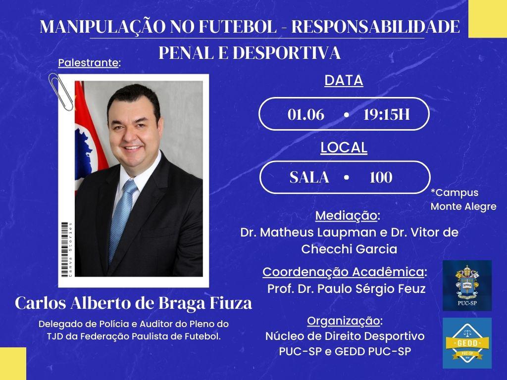- 19h15, na sala 100 (1º andar do prédio novo), o delegado de polícia e auditor do Pleno do Tribunal de Justiça Desportiva (TJD) da Federação Paulista de Futebol, Carlos Alberto de Braga Fiuza, aborda o tema “Manipulação no Futebol – Responsabilidade Penal e Desportiva”, com mediação dos mestrandos Matheus Laupman e Vitor de Checchi Garcia.