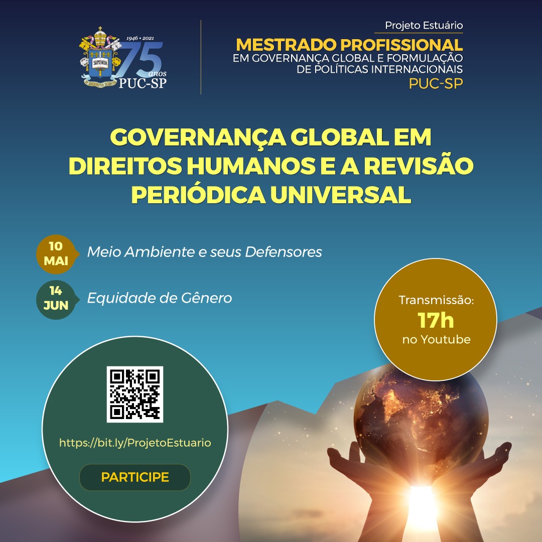 O mestrado profissional em Governança Global e Formulação de Políticas Internacionais realiza, dias 10/5 e 14/6, dois debates organizados pelos alunos, sobre o tema Governança Global em Direitos Humanos e Revisão Periódica Universal.