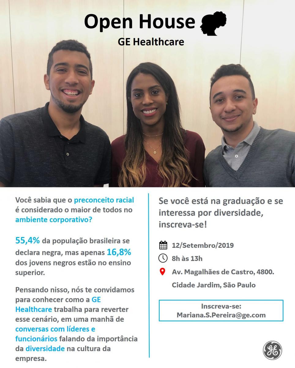 Dia 12/9, às 13h, será realizado a Open House GE Healthcare, uma manhã de conversas com líderes e funcionários para abordar a importância da diversidade nas organizações. Clique aqui para saber mais.
