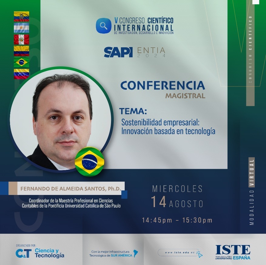 O prof. Fernando Almeida Santos, coordenador do Pós em Ciências Contábeis, Controladoria e Finanças da PUC-SP e Conselheiro Notável do Instituto dos Contadores do Brasil (ICBR), realiza a palestra magna do Tecnologico Superior Universitário España (ISTE), em Ambato, Equador.