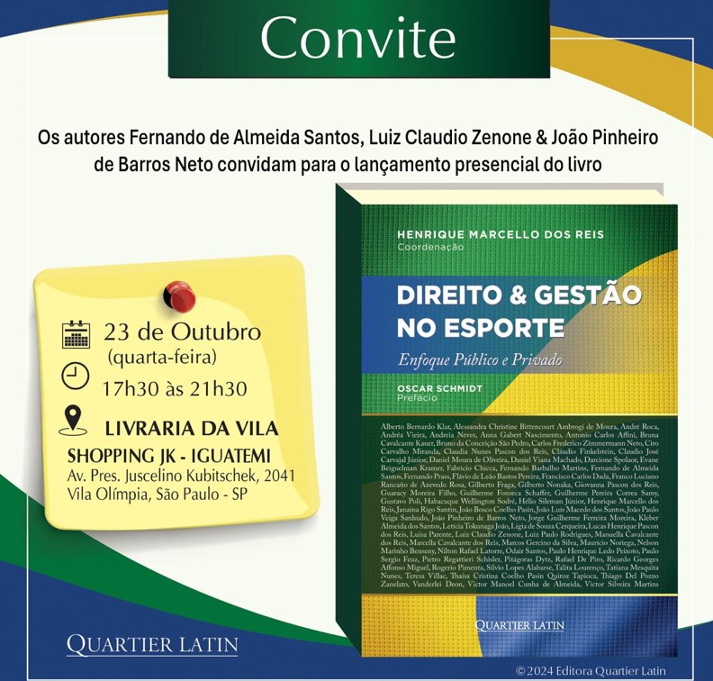 No dia 23/10, das 17h30 às 21h30, acontece o lançamento do livro "Direito & Gestão no Esporte" (Quartier Latin), com a participação dos professores Fernando de Almeida Santos (Pós em Ciências Contábeis), Luiz Claudio Zenone (FEA) e João Pinheiro de Barros Neto (FEA). O evento acontece na Livraria da Vila, no Shopping Iguatemi.