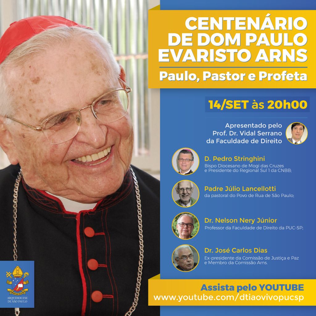 Dia 14/9, às 20h, se realiza evento, pelo youtube, em celebração ao centenário de Dom Paulo Evaristo Arns. Na ocasião, será realizada a mesa Centenário de Dom Paulo Evaristo Arns: Paulo, pastor e profeta.