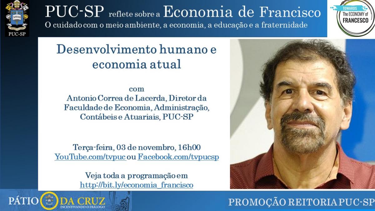 Dia 3/11, às 16h, acontece mais um encontro virtual do evento PUC-SP reflete sobre a Economia de Francisco: o cuidado com o meio ambiente, a economia, a educação e a fraternidade. Promovido pela Reitoria e pelo Núcleo Fé e Cultura, o evento oferece uma série de encontros até o mês de novembro. Clique aqui para ver a programação completa.