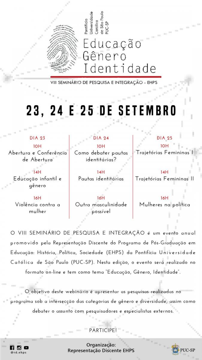 De 23 a 25/9, contece o VIII Seminário de Pesquisa e Integração, evento anual promovido pela Representação Discente do Pós em Educação: História, Política, Sociedade (EHPS).