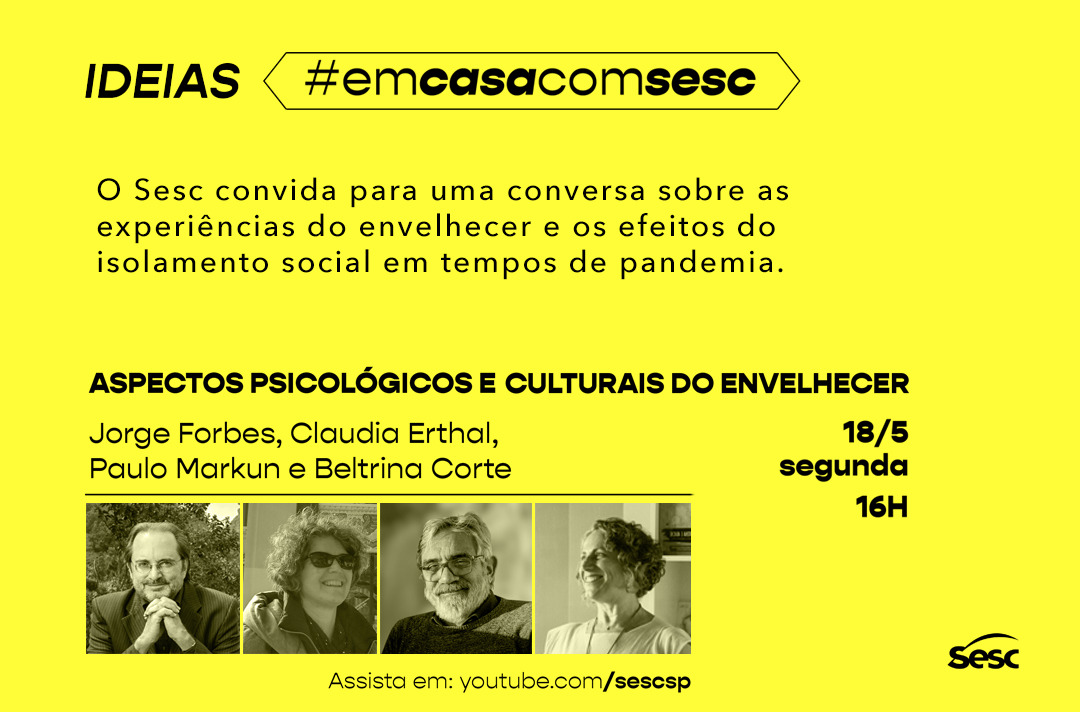 A profa. Beltrina Corte (Pós em Gerontologia) participa de evento do SESC que discute experiências do envelhecer e do isolamento social durante a quarentena. O evento acontece dia 18/5, às 16h.