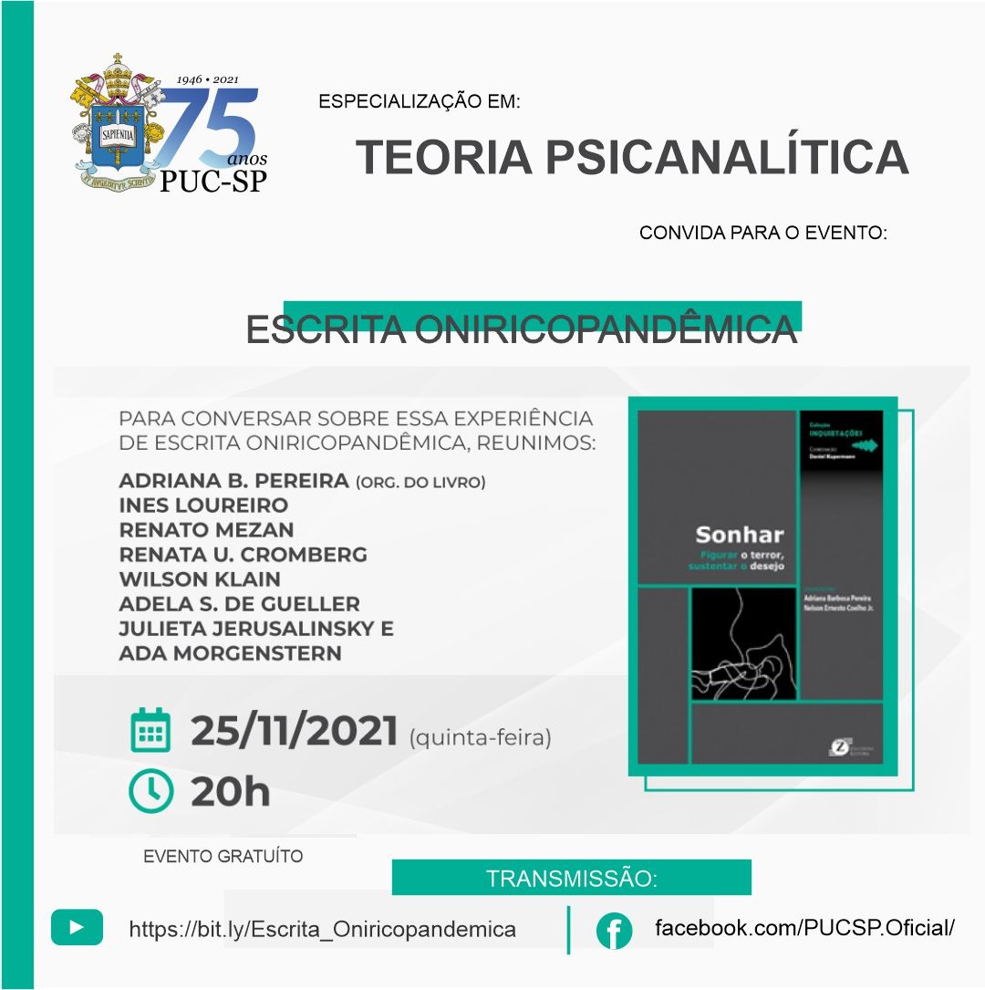 O curso de Especialização em Teoria Psicanalítica realiza o minicurso gratuito Escrita oniricopandêmica, dia 25/11, às20h.