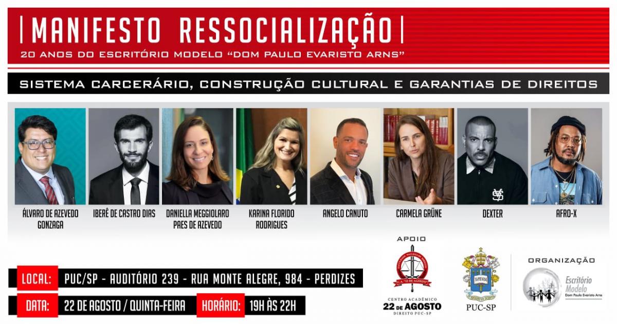 Ao completar 20 anos de existência, o Escritório Modelo Dom Paulo Evaristo Arns, em parceria com o Centro Acadêmico 22 de Agosto (Direito - PUC-SP), realiza o evento Sistema Carcerário, construção cultural e garantias de direitos, quando haverá o lançamento do Manifesto Ressocialização.