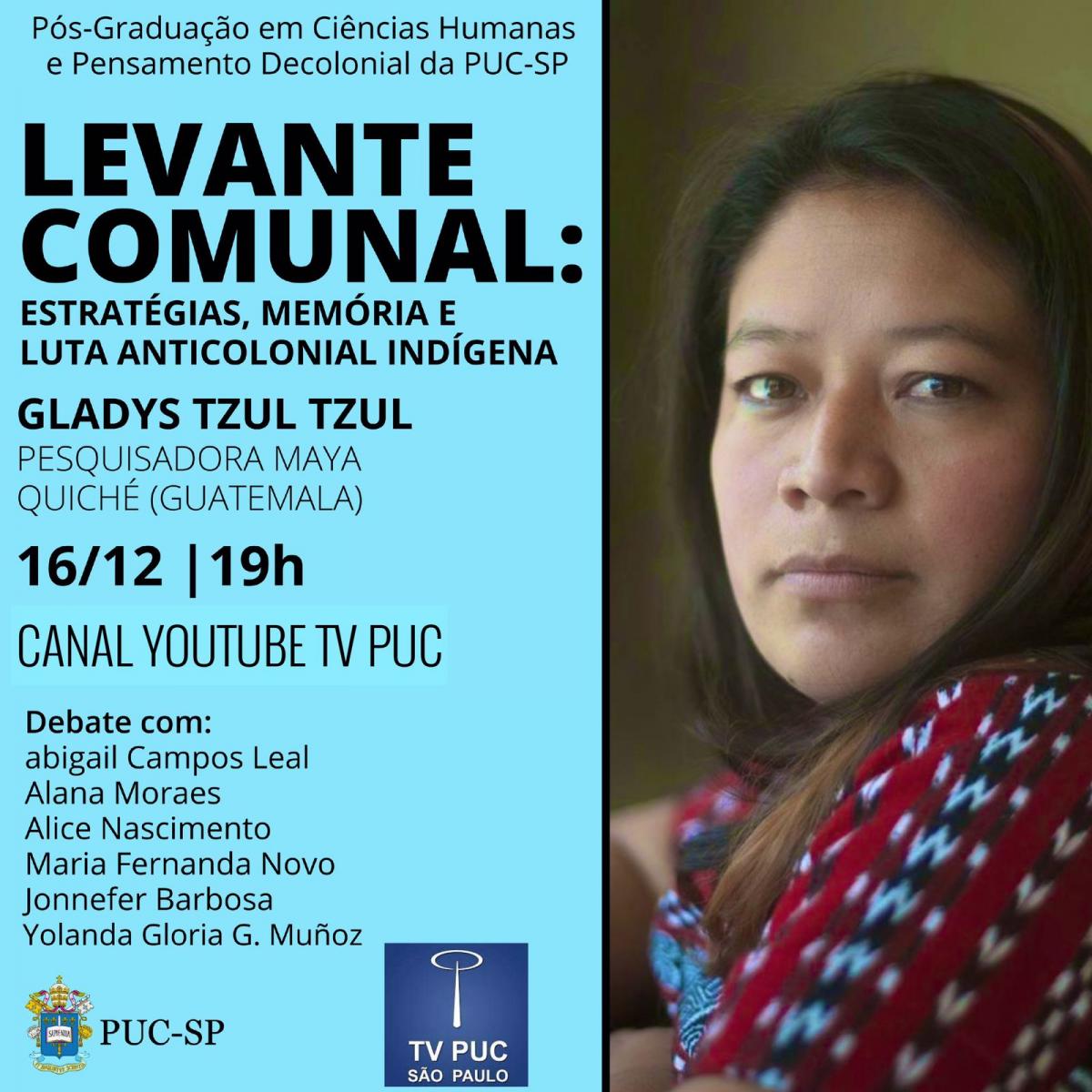 A especialização em Ciências Humanas e Pensamento Decolonial promove no dia 16/12, às 19h, via canal da TV PUC-SP no YouTube, o evento Levante Comunal: estratégias, memória e luta anticolonial indígena, com a participação de Gladys Tzul Tzul, pesquisadora maya quiché (Guatemala). O debate contará com a participação das professoras Abigail Campos Leal, Alana Moraes, Alice Nascimento, Maria Fernanda Novo, Yolanda Gloria Muñoz e do professor Jonnefer Barbosa.
