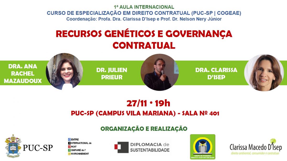 O curso de Especialização em Direito Contratutal realiza sua primeira aula internacional, dia 27/11, às 19h, na unidade Vila Mariana. Coordenado pelos profs. Clarissa D´Isep e Nelson Nery Júnior, a aula abordará o tema Recursos Genéticos e Governança Contratual.