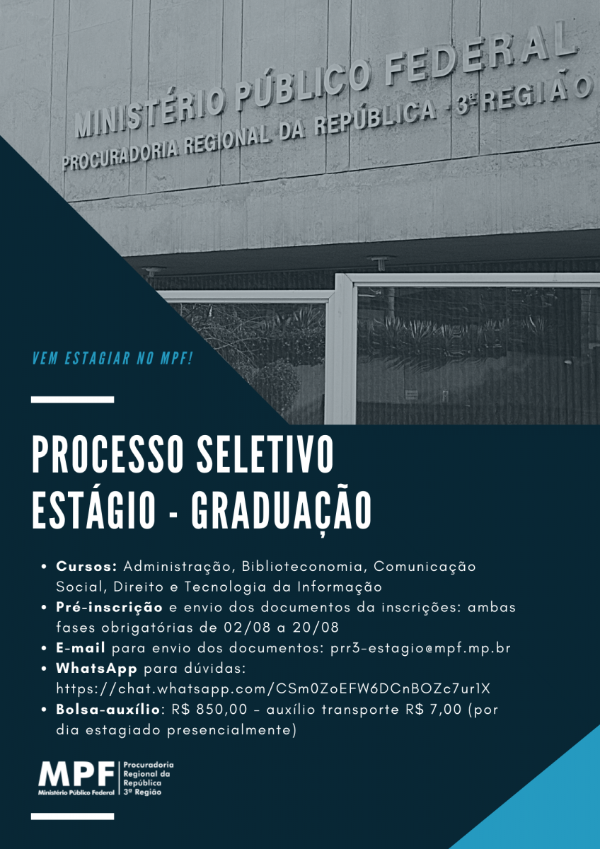 O Ministério Público Federal está com inscrições abertas para vagas de estágios em diversas áreas. Veja mais informações na imagem abaixo.