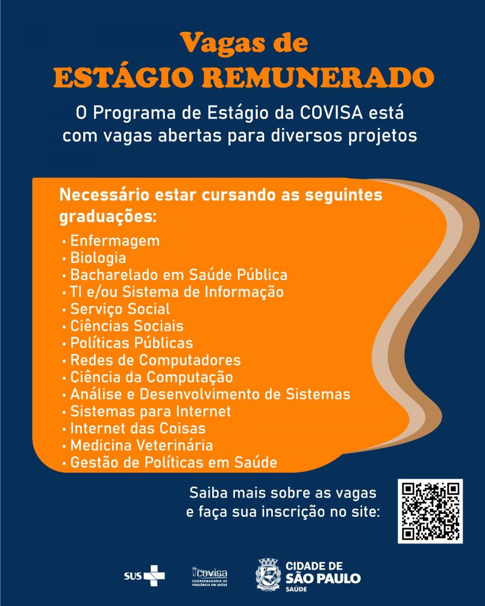 A Coordenadoria de Vigilância em Saúde (Covisa) está com vagas de estágio abertas para diversas áreas. Clique aqui para saber mais.