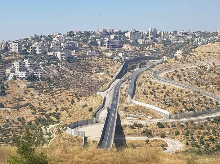 *legenda da foto tirada por Arturo: Rodovia exclusiva para colonos judeus que corta Jerusalém, acompanhada pelo Muro de separação, que limita os vilarejos palestinos