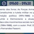 9h às 9h30: Lançamento dos livros da Editora da PUC-SP (Educ): As Forças Armadas e o Poder Constituinte: a tutela militar no processo de transição política (1974-1988) e Poder Constituinte e Democracia: a atuação das esquerdas e dos movimentos sociais na transição política (1984-1988), com o autor: Prof. Dr. Pedro Gustavo Fernandes Fassoni.