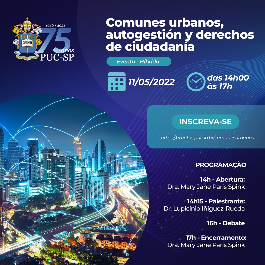 O Pós em Psicologia Social realiza, dia 11/5, às 14h, o evento Comunes urbanos, autogestión y derechos de ciudadanía. Interessados em participar devem fazer inscrição neste link. A ativdade será híbrida, com realização presencial no auditório 239 (2º andar, prédio Novo, campus Monte Alegre). Na confirmação da inscrição, que seguirá por e-mail, os participantes também receberão as orientações para o acesso à transmissão online.