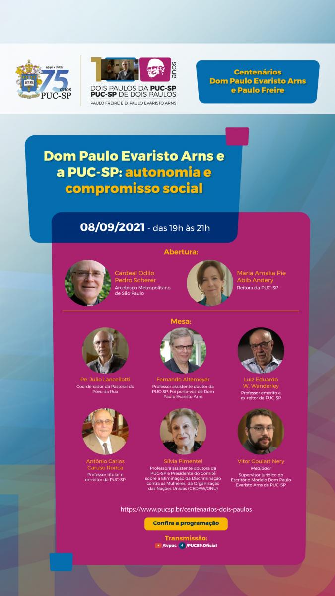 A PUC-SP dá prosseguimento, no dia 8/9, às 19h, ao evento que celebra os centenários de Dom Paulo Evaristo Arns e Paulo Freire. Neste dia, pelo youtube, será realizada a mesa Dom Paulo Evaristo Arns e a PUC-SP: autonomia e compromisso social. Clique aqui para participar do evento.