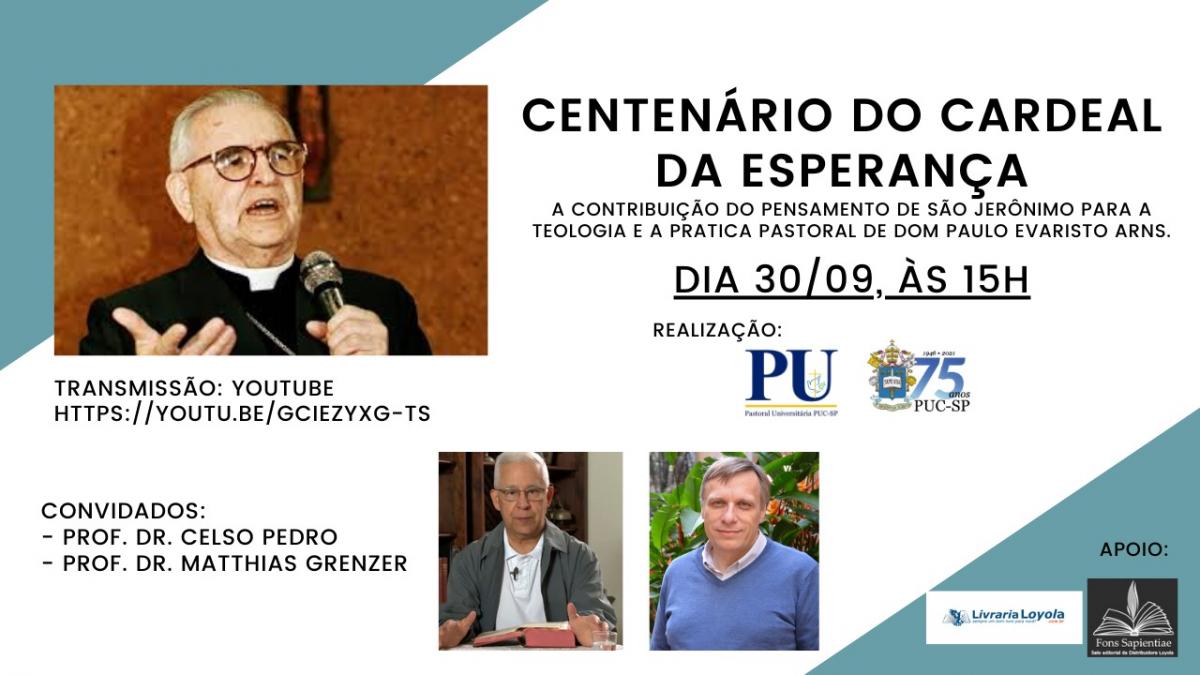 A Pastoral Universitária promove, dia 30/9, às 15h, o evento Centenário do Cardeal da Esperança, em referência aos 100 anos de Dom Paulo Evaristo Arns.