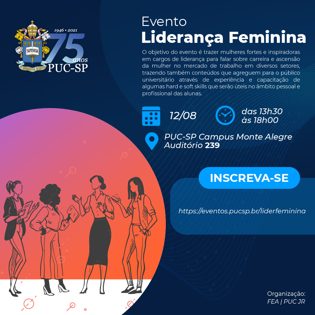 A Faculdade de Economia, Administração, Contábeis e Atuariais (FEA) e a PUC FEA Jr realizam o evento Liderança Feminina, dia 12/8, às 13h30.