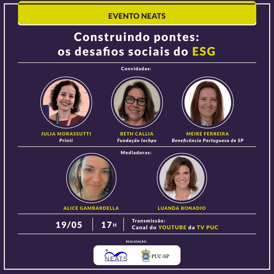 Dia 19/5, às 17h, o Núcleo de Estudos Avançados do Terceiro Setor (Neats, pós em Administração) realiza o evento Construindo pontes: os desafios sociais da ESG. O objetivo é discutir a pauta ESG, principalmente, na perspectiva do social, sob o olhar de lideranças mulheres que atuam no mercado.