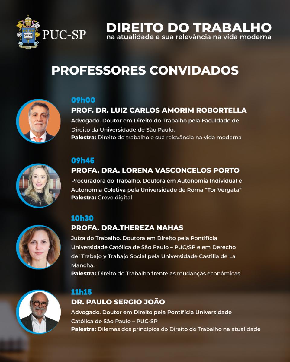 Dia 7/5, às 9h, acontece o evento Direito do Trabalho na atualidade e sua relevância na vida moderna, no auditório 100 (1º andar, prédio novo, campus Monte Alegre). Clique aqui para se inscrever. Haverá transmissão online.