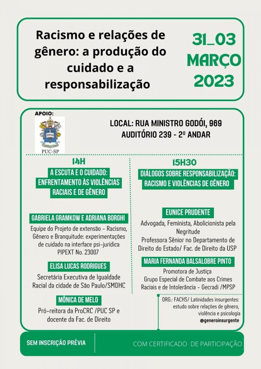 Dia 31/3, às 14h, a Faculdade de Ciências Humanas e da Saúde (FACHS) é organizadora do evento Racismo e relações de gênero: a produção do cuidado e a responsabilização, promovido pelo Núcleo de Relações de Gênero e Psicologia: Latinidades Insurgentes.