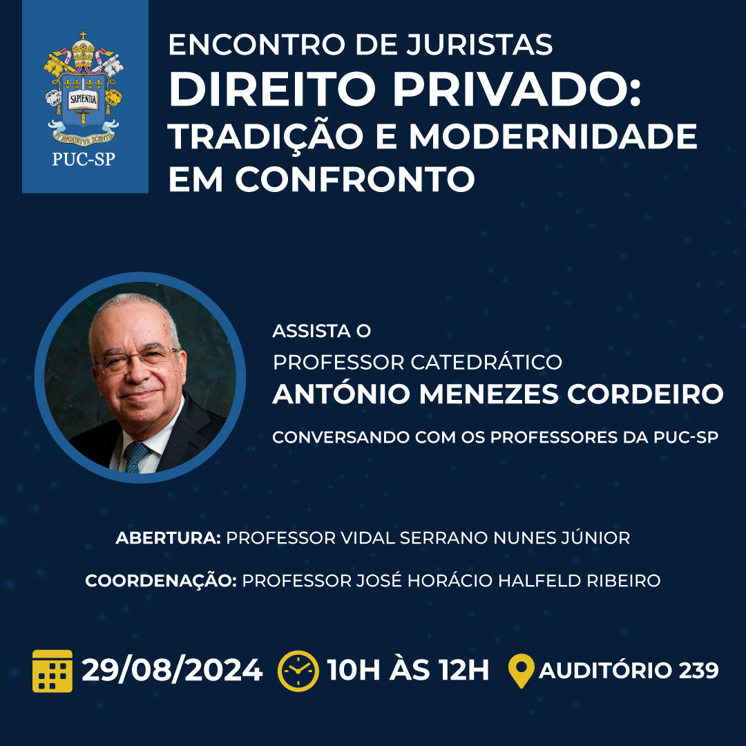 O evento contará com o prof. António Menezes Cordeiro, com aberta do prof. Vidal Serrano Nunes Júnior e coordenação do prof. José Horácio Halfeld Ribeiro.