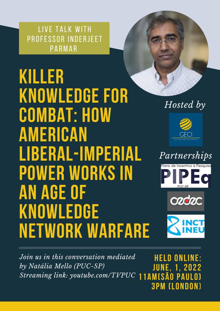 Dia 1º/6, às 11h, o Grupo de Estudos sobre Conflitos Internacionais da PUC-SP (GECI) realiza palestra com o prof. Inderjeet Parmar. O docente estudou Sociologia na London School of Economics e Sociologia Política na Universidade de Londres. Seu doutorado, pela Universidade de Manchester, foi nas áreas de ciência política e relações internacionais. Parmar é ex-presidente, presidente e vice-presidente da British International Studies Association. Atualmente, é professor Visitante na LSE (2019-2022) e pesquisador visitante no Rothermere American Institute, Oxford.