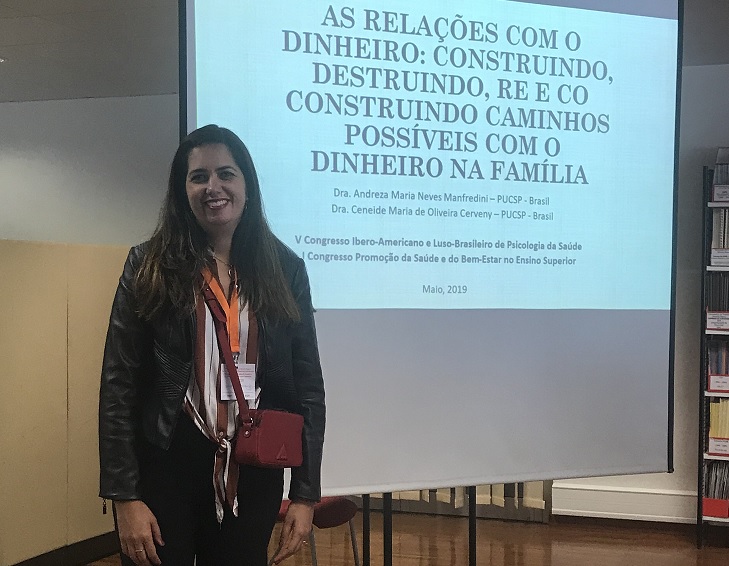 A ex-aluna do Pós em Psicologia Clínica Andreza Maria Neves Manfredini participou de eventos internacionais nos meses de maio e julho para apresentar trabalhos desenvolvidos na PUC-SP, entre eles a tese de doutorado "As relações com o dinheiro: construindo, destruindo, re e co-construindo as relações com o dinheiro", defendida em março deste ano na Universidade, com orientação da professsora Ceneide Maria de Oliveira Cerveny. Andreza esteve no V Congresso Ibero-Americano e Luso-Brasileiro de Psicologia da Saúde e I Congresso Promoção da Saúde e do Bem-Estar no Ensino Superior, que aconteceu na Universidade de Algarve, em Portugal, entre os dias 9 e 11/5, e apresentou na modalidade de comunicação livre os seguintes trabalhos: “Mitos familiares: uma pesquisa bibliográfica”; “As relações com o dinheiro: construindo, destruindo, re e co-construindo caminhos possíveis com o dinheiro na família” e “Dinheiro e Família: uma pesquisa bibliográfica nos últimos 30 anos”.