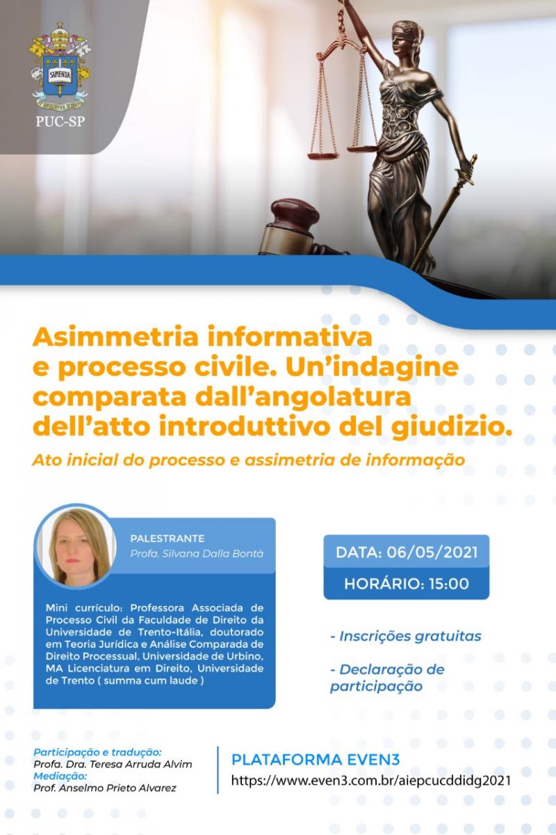 O evento será realizado dia 6/5, às 15h. Organização: Faculdade de Direito e Grupo de Pesquisa PUC/SP-CNPQ "Os impactos do código de Processo Civil de 2015 na democracia e sociedade".