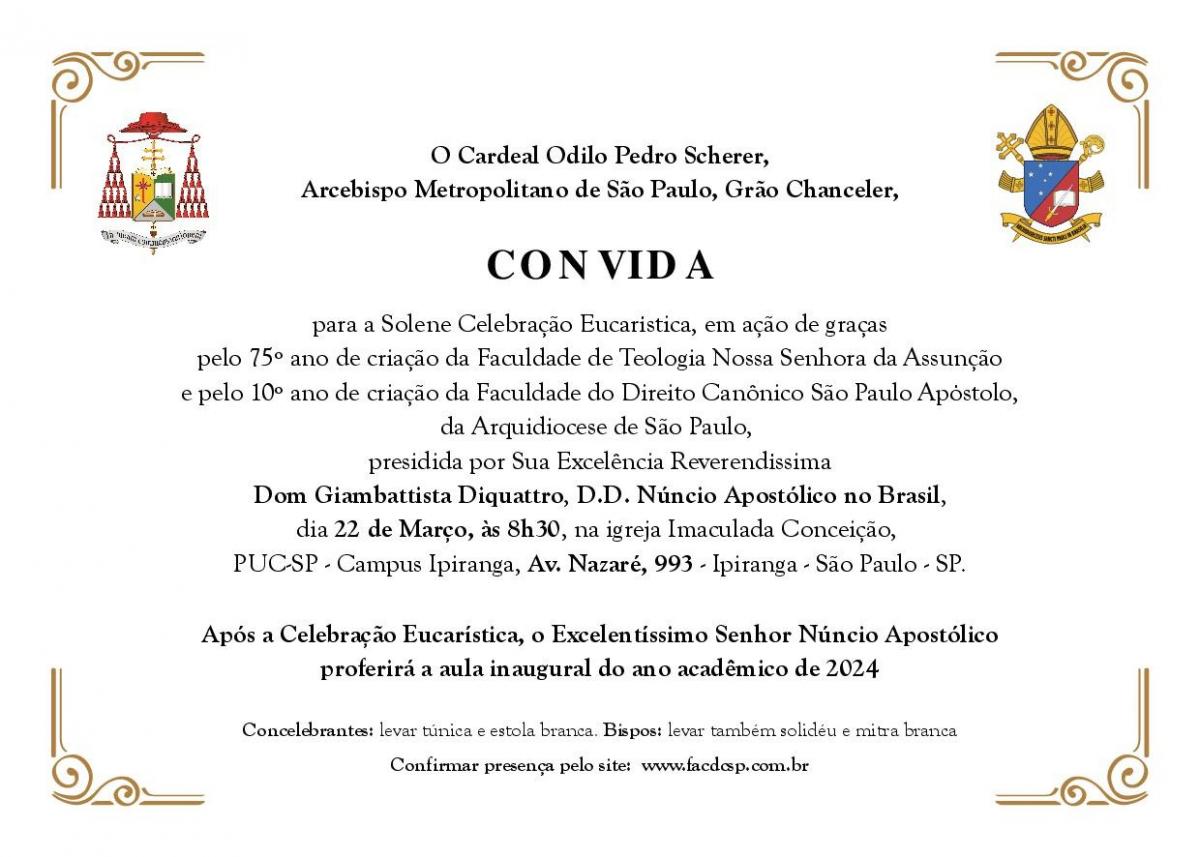 Neste ano, a Faculdade de Teologia Nossa Senhora da Assunção, da PUC-SP, completa 75 ano, e a Faculdade de Direito Canônico São Paulo Apóstolo completa 10. Para celebrar os aniversários, no dia 22/3, às 8h30, o Cardeal Odilo Pedro Scherer, Arcebispo Metropolitano de São Paulo, Grão Chanceler, convida a comunidade acadêmica para a Solene Celebração Eucarística. A ação contará com a presença do Senhor Núncio Apostólico do Brasil, Dom Giambattista Diquattro, que fará a aula inaugural do ano acadêmico de 2024 e a missa na Igreja Imaculada Conceição, no campus Ipiranga.