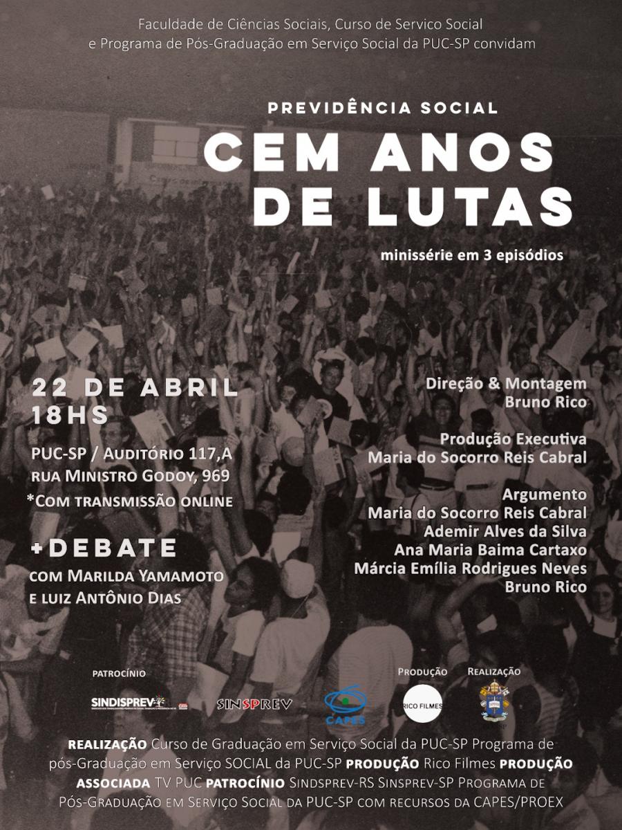 A Faculdade de Ciências Sociais, o Curso de Serviço Social e o Programa de Pós-Graduação em Serviço Social da PUC-SP promovem a exibição de minissérie Previdência Social Cem Anos de Lutas. Acontecerá, após a exibição, um debate com Marilda Yamamoto e Luiz Antônio Dias.