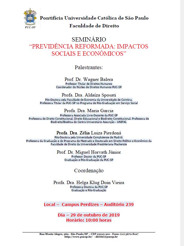 Aconteceu no dia 29/10, o seminário Previdência Reformada: Impactos Sociais e Econômicos", com os professores palestrantes Wagner Balera (Pós em Direito), Aldaíza Sposati (Pós em Serviço Social), Maria Garcia(UNIFAI), Zélia Luiza Pierdoná (Universidade Presbiteriana Mackenzie), Miguel Horvath Júnior (Pós em Direito) e Helga Doin Vieira (Pós em Direito).