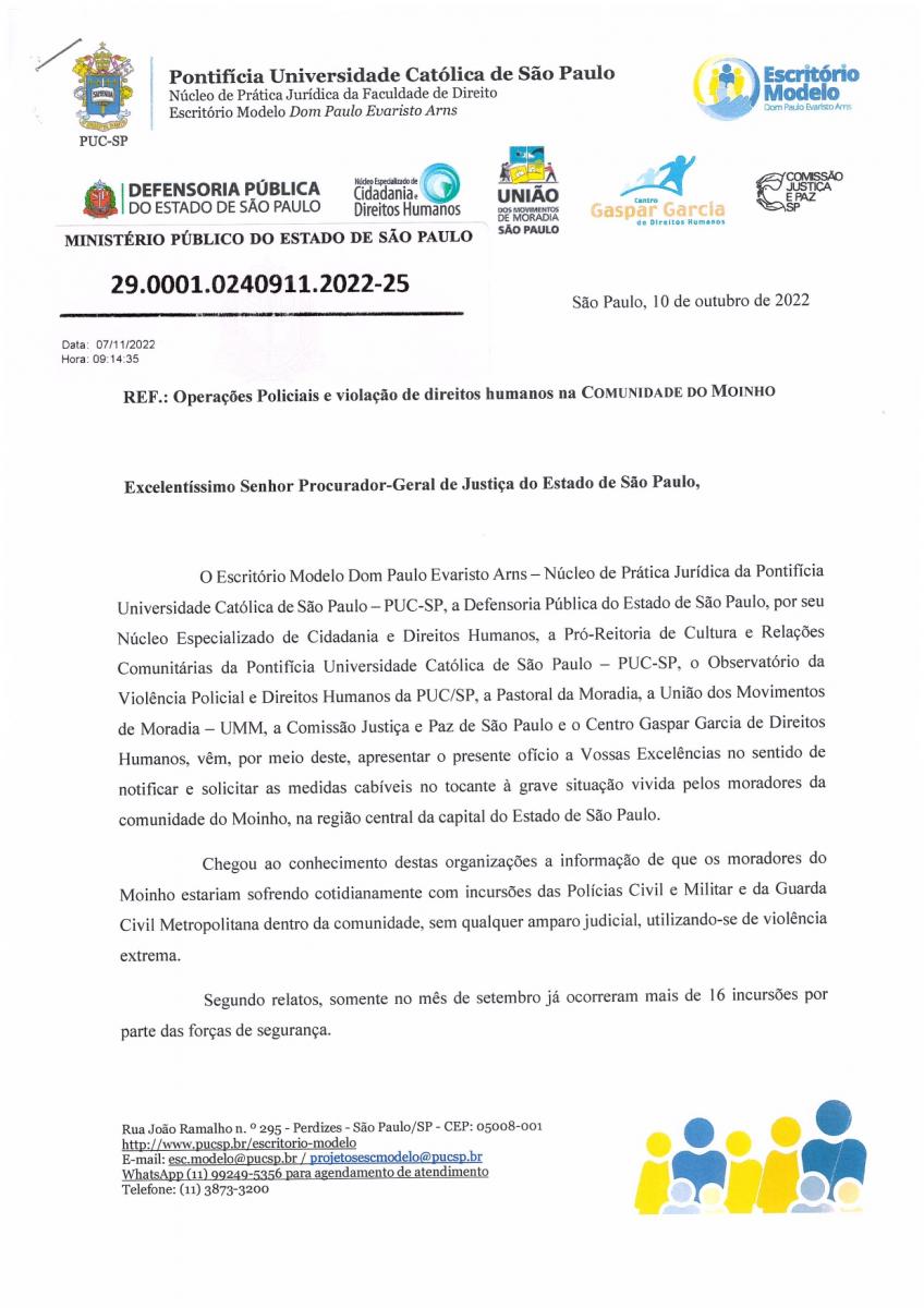 Diante de tais narrativas, o Escritório Modelo Dom Paulo Evaristo Arns, em conjunto com a Pró-Reitoria de Cultura e Relações Comunitárias (Pró-CRC/PUC-SP), o Observatório de Violências Policiais e Direitos Humanos, a Defensoria Pública do Estado de São Paulo, por seu Núcleo Especializado de Cidadania e Direitos Humanos, a Pastoral da Moradia, a Comissão Justiça e Paz de São Paulo, o Centro Gaspar Garcia de Direitos Humanos e a União dos Movimentos de Moradia - UMM, protocolaram ofício junto ao secretário de Segurança Pública do Estado, ao secretário de Segurança Urbana do Município, ao procurador-geral de Justiça, ao ouvidor das Polícias, ao presidente da Comissão de Direitos Humanos da Alesp, a presidente da Comissão de Direitos Humanos da Câmara dos Deputados, ao presidente do Conselho Nacional de Direitos Humanos e ao presidente do Conselho Estadual de Defesa dos Direitos da Pessoa Humana, requerendo que sejam tomadas as medidas cabíveis, no âmbito de suas atribuições, para apurar eventuais ações abusivas por parte das Polícias Civil e Militar e da Guarda Civil Metropolitana no território do Moinho, bem como para apurar responsabilidades por condutas ilegais de servidores públicos, garantindo, se cabível, sua consequente responsabilização, além da interrupção imediata de quaisquer atividades eventualmente identificadas como abusivas e/ou ilegais praticadas pelo ente público.