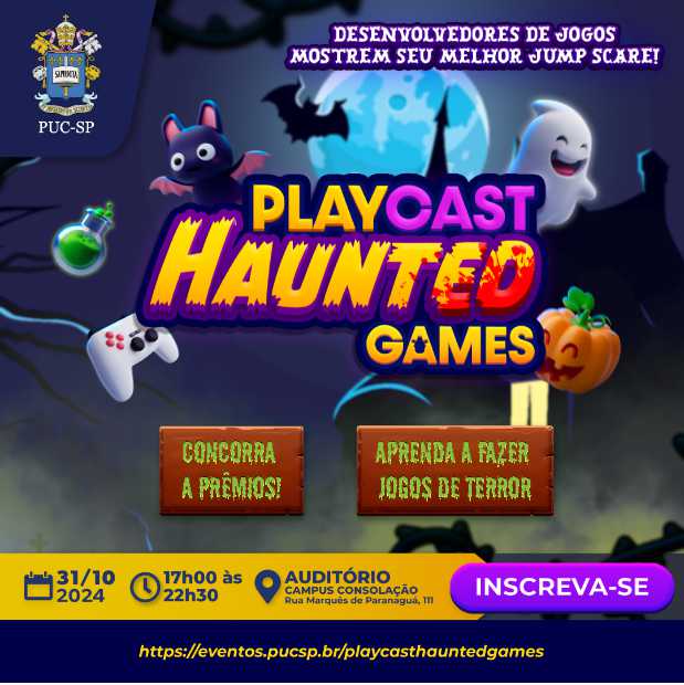Informações e inscrições: link na bio ou acesse: https://eventos.pucsp.br/playcasthauntedgames.