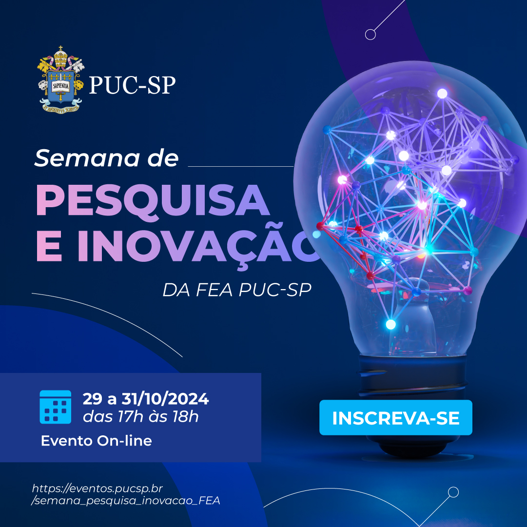 A Faculdade de Economia, Administração, Contábeis e Atuariais (FEA) promove a Semana de Pesquisa e Inovação. Atividades acontecem de 29 a 31/10, das 17h às 18h, de forma virtual.